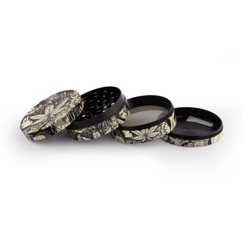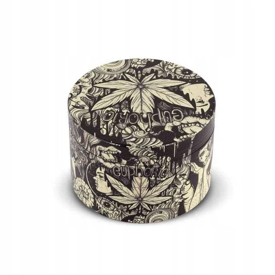 Denna grinder från Euphoria har fyra delar med mönster på locket och botten. Skruv stängning och separat kief-uppsamling i bottenkammaren för framtida användning av trikomer.