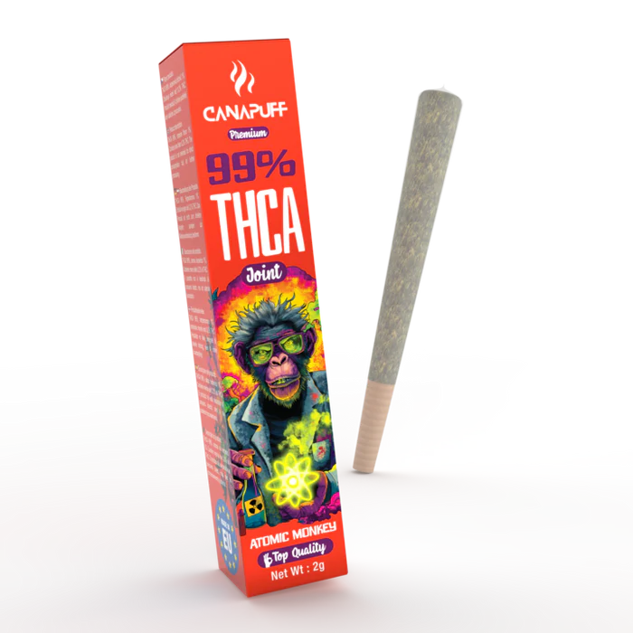THCA Joint Atomic Monkey 99% 2g från Canapuff är en färdigrullad cannabisprodukt med 99 % ren THCA. Varje joint är jämnt fylld med utvalt blommaterial för en tydlig, jordig och citrusfrisk profil. Säljs i 2 grams storlek och är laboratorietestad samt helt laglig inom EU.