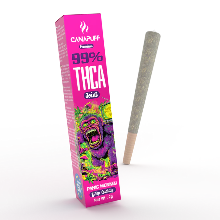 THCA Joint Panic Monkey 99% 2g från Canapuff är en färdigrullad joint med hela 99 % THCA. Varje joint har en jämn, clean yta och levererar en livlig arom med fruktiga och lätt kryddiga toner. Laboratorietestad och 100 % laglig – för dig som söker renhet och tydlighet i cannabinoidprofilen.