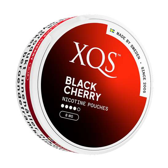 XQS Black Cherry Strong är ett starkt, tobaksfritt all white-snus i smalt slimformat med en intensiv och söt smak av körsbär. Denna variant har en högre nikotinhalt på 8 mg per portion (16 mg/g) vilket ger en kraftigare nikotinupplevelse än originalversionen.